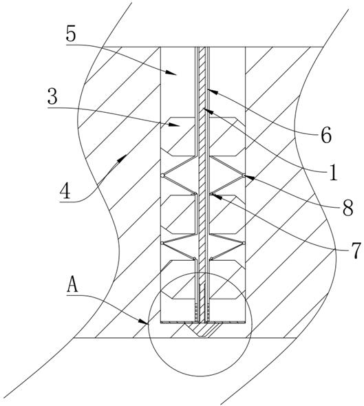 本实用新型提供一种抗浮锚杆施工结构,包括岩土层,所述岩土层内开设有锚杆孔,锚杆孔内装设有锚杆体,锚杆孔内装设有多个与锚杆体相对应的定位块,锚杆体的底部装设有与岩土层相对应的承压板,锚杆体的周侧装设有锚杆套,锚杆套的侧面装设有多个与定位块相对应的限位杆,限位杆的上侧装设有第一转轴,第一转轴与锚杆套转动配合,锚杆体下侧滑动配合有压板。在本实用新型中,在锚杆体的周侧安装锚杆套,在锚杆套的侧面安装限位杆,在限位杆的上侧安装第一转轴,能够在安装后对锚杆体进行保护,同时增大锚杆体所能承受的力,锚杆套可以形成三角结构,当出现缝隙后,三角结构可以对缝隙进行补偿,防止水从缝隙内灌入,提高防水效果。