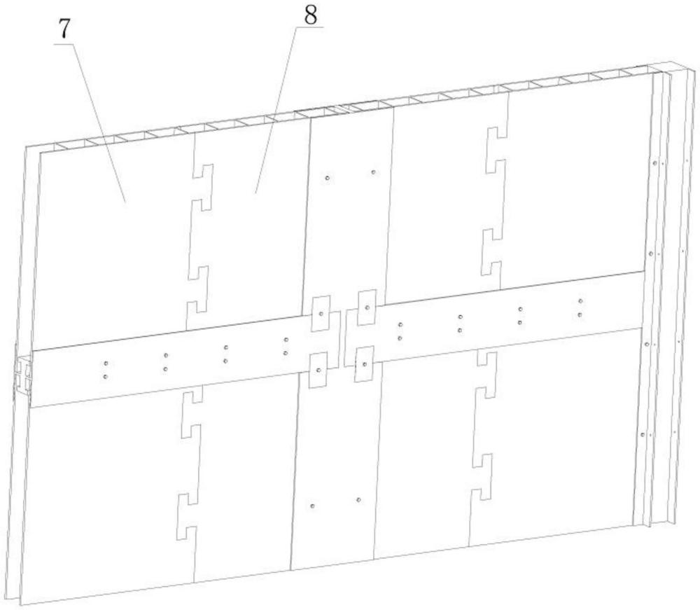本实用新型涉及建筑材料技术领域,具体公开了一种拼装简易的墙体板组件,包括预制板Ⅰ、预制板Ⅱ和连接件;预制板Ⅰ和预制板Ⅱ内部均设有夹芯板,预制板Ⅰ和预制板Ⅱ通过榫卯件连接;夹芯板包括钢板和铝板,钢板和铝板通过若干个芯板连接,相邻两组芯板之间设有用于填充隔热隔音材料以及走水走电的空腔;本实用新型中各个墙体板通过榫卯链接和螺栓连接相结合的方式进行拼装,简化施工流程,实现快速拼装,采用预制型轻质钢铝三明治墙体板作为夹芯板,可显著减小墙体板结构的重量,满足墙体板轻量化的需求,在夹芯板中填充保温隔热材料和走水走电,减少噪音,大大降低建设成本和维修成本。