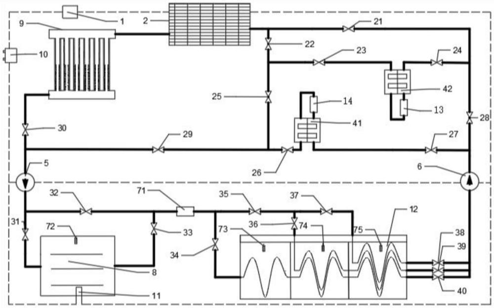 本实用新型提供了一种多级相变储热式太阳能干燥装置,包括控制器、太阳能光伏光热一体化装置、阀门、冷凝器、热管换热器、空气循环泵、多级相变储热装置、干燥箱、太阳能空气集热器、蓄电池、辅助热源、温度传感器。蓄电池与太阳能光伏光热一体化装置、空气循环泵Ⅰ、空气循环泵Ⅱ、控制器、辅助热源连接,为其提供电能。本实用新型在利用太阳能干燥的同时,将多余的太阳能蓄起来,蓄热方式是相变蓄热,在夜间或没有太阳光的时候再把这部分热量释放出来进行利用,实现了连续干燥。本系统针对不同干燥阶段用温需求不同的特点,可达到高效分阶段控温的目的,最终实现能量梯级利用、高效余热回收及降低系统热量损失。