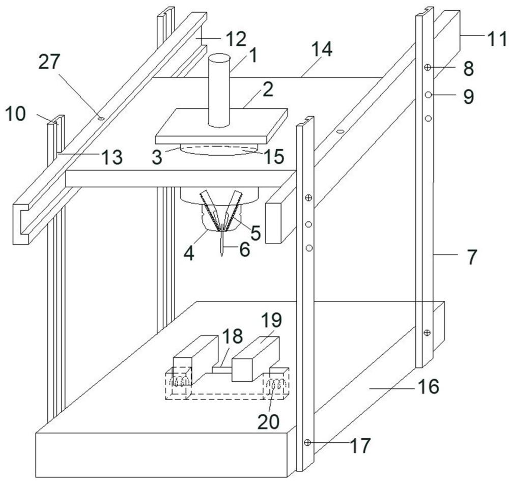 本实用新型属于电缆加工检测技术领域,公开了一种制作电树老化电缆块状样本针孔缺陷的装置,以解决现有技术加速电树老化电缆样本针孔制作中存在的技术问题,该装置包括底座,底座上装有弹性卡装座,底座的两侧均装有一组竖向支座,竖向支座的内侧装有横向固定座,横向固定座的内侧设有横向凹槽,横向凹槽内滑动装有横向支座,横向支座的中部套装有套筒,套筒的顶部设有挡板,挡板上固定有手柄,套筒的底部装有夹具座,夹具座的底部装有扎孔钢针。本实用新型的水平及竖直位置均可调节,扩大了样本的范围,可以方便地在样本上连续制作多个针孔缺陷。套筒可沿垂直方向穿过固定支架横向固定板中间孔移动,从而在样本上制作出标准化针孔缺陷。