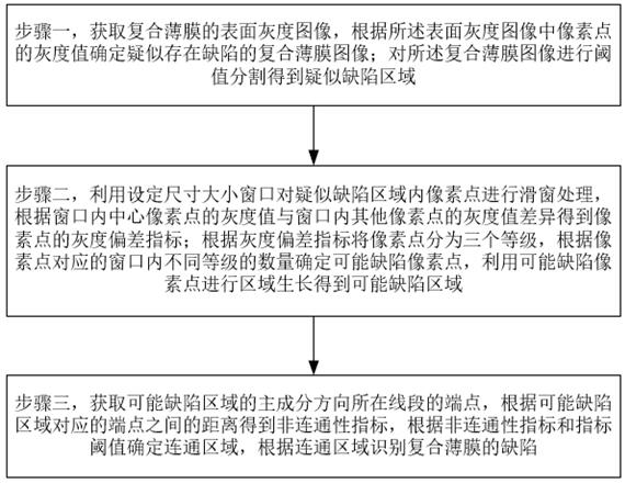 本发明涉及缺陷识别技术领域,具体涉及一种复合薄膜缺陷识别方法,该方法包括:获取复合薄膜的表面灰度图像,根据灰度值确定疑似存在缺陷的复合薄膜图像;对图像进行分割得到疑似缺陷区域;根据设定尺寸大小的窗口内中心像素点的灰度值与窗口内其他像素点的灰度值差异得到像素点的灰度偏差指标;根据灰度偏差指标将像素点分为三个等级,确定可能缺陷像素点,利用可能缺陷像素点进行区域生长得到可能缺陷区域;获取可能缺陷区域的主成分方向所在线段的端点,根据可能缺陷区域对应的端点之间的距离得到非连通性指标,根据非连通性指标和指标阈值确定连通区域,根据连通区域识别复合薄膜的缺陷,本发明能够获得准确的缺陷识别结果。