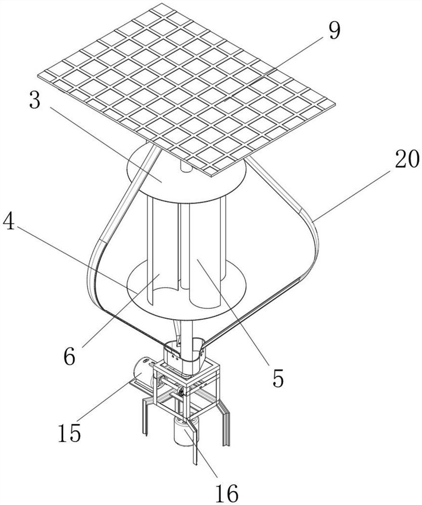 本实用新型公开了一种风能光能互补发电的节能环保发电装置,具体涉及风能光能互补发电技术领域,包括第一加强支撑架,所述第一加强支撑架的顶部设置有发电组件,所述发电组件包括设置在第一加强支撑架上的转轴。本实用新型通过设置发电组件,当风力与连接筒相接触时,会最先通过回流槽在连接筒上形成回流,并通过回流槽导出,提高了连接筒与风力之间的风阻,继而提高了连接筒带动转轴旋转时的牵引力,提高了风力发电的动力,而当第一伞齿轮旋转时会使得横轴旋转,并使得第一发电机和第二发电机能够实现同轴双向将风能转换为电能,提高了本实用新型在使用时的发电效率,方便使用的同时具有良好的实用性。
