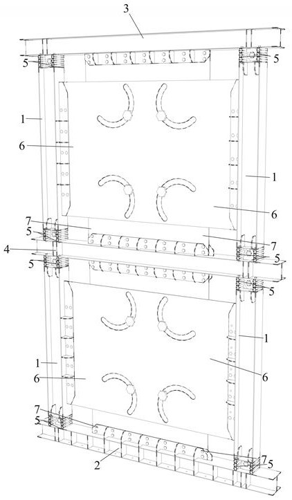 本实用新型涉及土木工程减震技术领域,特别涉及一种装配式自复位可控铰耗能连接组件及系统。包括复位系统,复位系统包括拱形弹簧和螺杆,两个拱形弹簧开口端扣合对叠组成复位单元,多个复位单元进行叠合组成复位系统,复位系统的拱形弹簧上开设穿接孔,穿接孔穿入螺杆连接组成弹簧组。实用新型与传统同类型构件相比,减少了焊接连接方式的使用,主体受力连接件全部使用螺栓连接,避免了因焊接产生的残余应力;由于耗能元件为剪力墙之间的摩擦作用,其构造形式决定了其耗能性能更加稳定可靠,且破坏形态易于控制,破坏部位能够预先设防,该形式的耗能钢板性能能够得到有效的保障,易于广泛应用推广。