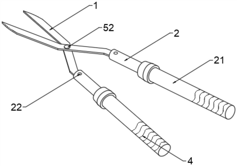 本实用新型公开了一种景观设计用修剪装置,包括剪刀组件、伸缩机构和锁紧机构,剪刀组件由两个剪叉臂组成,伸缩机构包括连接杆和连接套,连接杆设置于剪叉臂的一侧,连接杆的外壁与连接套的内壁活动穿插连接,锁紧机构包括圆台管和多个开槽,多个开槽呈环形阵列开设于连接套的端部,圆台管套设于连接套的端部。本实用新型利用圆台管和多个开槽的设置,通过圆台管对连接套的断口处进行挤压,使得连接套的断口处在多个开槽的作用下进行收缩并使其内壁抵住连接杆的外壁,从而对连接杆进行多点挤压定位,从而提高了连接杆在连接套内定位的稳定性,使得连接杆不易自动出现移动的现象,从而提高了修剪装置使用的稳定性。