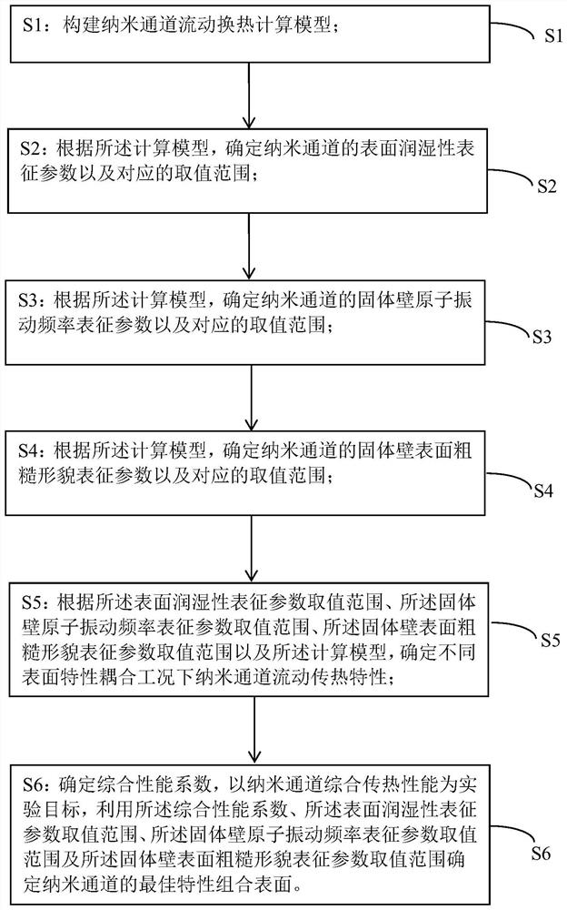 本发明公开了一种纳米通道最佳特性组合表面确定方法及装置,涉及微纳通道冷却技术领域,其中方法包括以下步骤:S1:构建纳米通道流动换热计算模型;S2:根据所述计算模型,确定纳米通道的表面润湿性表征参数以及对应的取值范围;S3:根据所述计算模型,确定纳米通道的固体壁原子振动频率表征参数以及对应的取值范围等步骤;本发明利用固体壁表面特性之间的耦合效应,在考虑流动阻力损耗的基础上提高纳米通道综合传热性能,为通道壁面结构优化设计提供理论参考,促进微纳通道冷却散热技术的高效利用。
