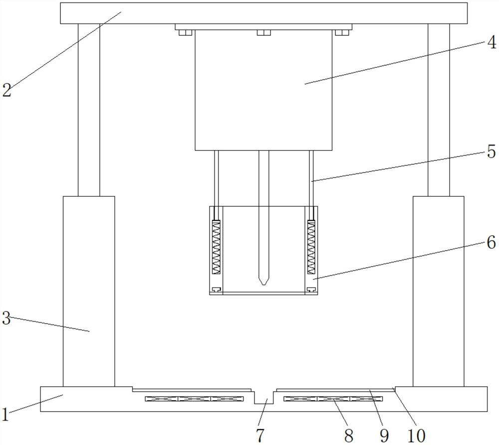 本实用新型涉及钻孔设备技术领域,公开了一种自动化设备配件自动固定定位钻孔装置,包括底座和升降板,升降板横向设置在底座的上方,且升降板的两侧和底座之间均竖向支撑固定有电推杆,底座的中部表面开设有支槽,支槽底部的底座内部嵌入固定有电磁铁,电磁铁设置有多个。本实用新型技术方案通过在支槽下方的底座内部嵌入固定有电磁铁,并在钻机下方的外圈环绕设置环筒,并使连杆伸入至环筒内部的滑槽内,使其底部的滑块与滑槽之间支撑弹簧,在钻机启动并被带动下降高度进行钻孔操作时,可以同时使电磁铁通电吸附金属板并被环筒下方外圈的橡胶圈抵紧锁定金属板,自动对金属板进行锁定然后钻孔,获得更高的钻孔效率。