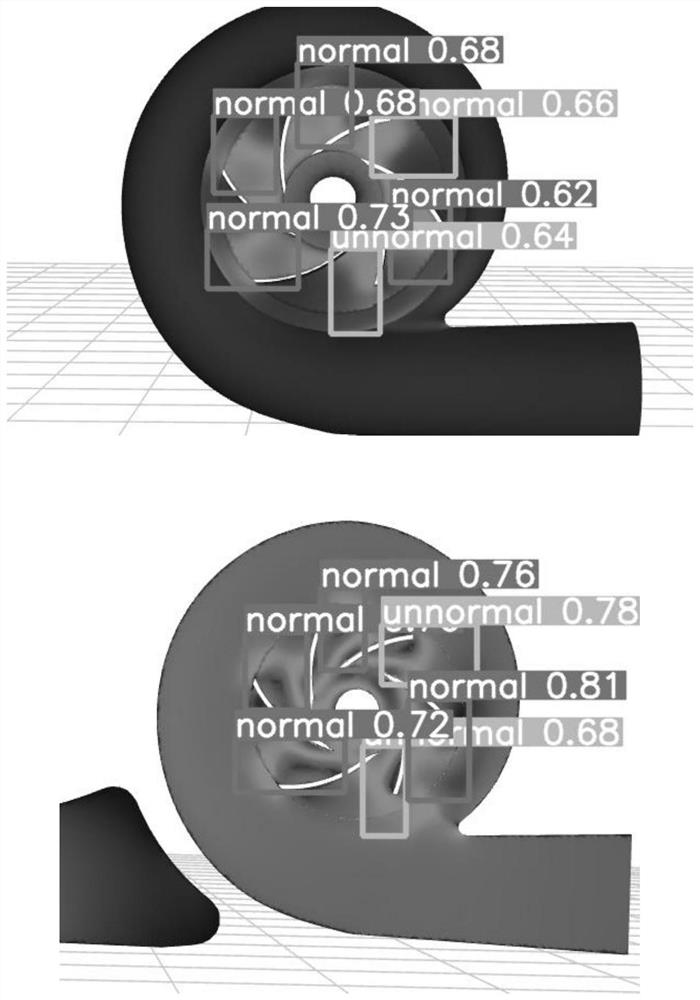 本发明公开了一种基于离心泵数字孪生模型的叶轮机械故障检测方法,通过构建离心泵数字孪生模型,获取压力、速度云图,然后根据实体离心泵的运行数据,使用计算机视觉网络模型对所述压力、速度云图进行识别检测,得到识别检测结果,进而对叶轮机械故障进行诊断,所述离心泵数字孪生模型包括,通过点云逆向建模建立的离心泵仿真实体模型;通过CFD数值模拟建立的内部属性模型;以及根据所述内部属性模型的数值预测结果选取的误差补偿模型。本发明构建的离心泵数字孪生模型具有较高的预测精度,基于该模型进行叶轮机械故障诊断,简单易行,具有良好的可实施性,并且能够快速、准确的给出叶轮故障诊断结果。