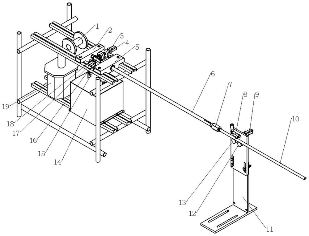 本发明属于喷涂装置技术领域,具体涉及一种小管径管路内壁电爆喷涂装置及方法。小管径管路内壁电爆喷涂装置包括高压电源、高压电极、接地电极、基管、材料丝、送丝机构和支撑架;接地电极位于基管内部,与基管电连接;基管与高压电源电连接,与支撑架连接;高压电极通过送丝机构与高压电源电连接;送丝机构与支撑架连接,用于夹持材料丝;材料丝穿过高压电极并靠近或穿入接地电极。本发明能够对小管径的管路内壁进行喷涂,装置简便,喷涂时所产生的热量小,不会对管路自身性能产生影响,得到的涂层与管路基体结合强度高,喷涂效果良好。