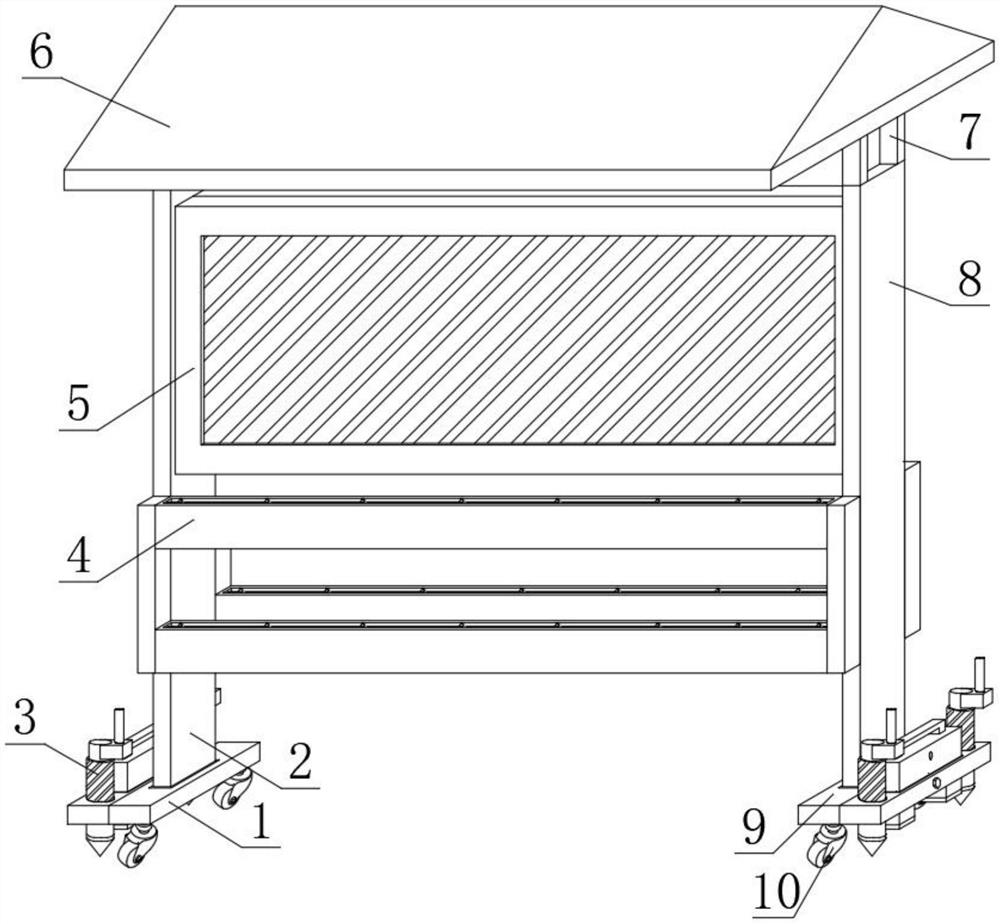 本实用新型公开了一种多功能的宣传栏,包括支脚a,位于支脚a右侧的支脚b,位于支脚a和支脚b下端前后侧的万向轮,所述支脚a和支脚b的左右两端外壁均设置有辅助固定装置,所述支脚b的右端外壁设置有固定板,所述固定板的上端外壁中心处且分别靠近前后两侧内部均设置有螺孔,两个所述螺孔的内部均设置有螺纹杆,所述固定板的上端外壁中心处内部设置有通过口,所述通过口的内部设置有固定块,所述固定块的上端外壁中心处设置有把手b,所述固定块的右端外壁中心处内部且靠近上下两侧均设置有固定孔,所述固定板的右端外壁中心处设置有向左贯穿的固定螺丝,通过辅助固定装置宣传栏能够在不同的环境中都能稳定的进行固定。