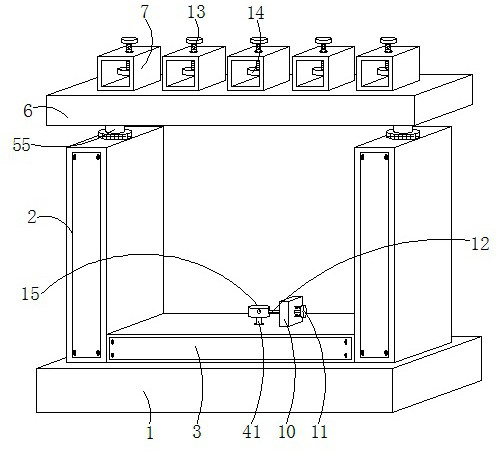 本实用新型公开了一种用于电线杆上的高压电线安装绝缘架装置,包括底板,所述底板顶部的两侧均安装有固定箱,所述底板顶部的中心处安装有箱体,所述箱体的内腔设置有驱动组件,所述固定箱的内腔设置有调节组件,通过第一旋转轴、第一主动锥齿轮、第一从动锥齿轮和第二旋转轴与第二主动锥齿轮、第二从动锥齿轮、丝杆、加长螺纹套和移动杆的配合,调节支撑架的高度,从而调节高压电线的安装高度,便于使用者进行调节,通过这样的调节便能适应不同的安装情况,通过滑槽和滑块的配合,便于使用者对加长螺纹套进行限位,通过支撑板、弹簧和卡杆的配合,对转柄固定,避免转柄转动导致支撑架的高度发生改变。
