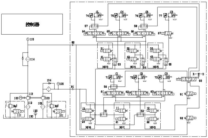 一种高速开关阀矩阵数字式换挡缓冲系统及控制方法。涉及数字液压控制系统领域。利用数字液压控制技术将高速开关阀建立液压桥路,组成数字液压阀矩阵,更具控制自主性和灵活性。包含液压动力单元、控制器和数字式离合器液压缸组;数字式离合器液压缸组将离合器分为三个组,分别为挡位数离合器组,功能离合器组和闭锁离合器组;挡位数离合器组液压缸分别前接有第一~三换向阀,功能离合器组液压缸分别前接有第四~六换向阀,锁闭离合器组液压缸前接有二位三通换向阀。采用由两个高速开关阀组成的液压半桥,通过调整PWM控制信号的占空比改变启闭状态,控制单个缸的压力,按照预期目标变化,控制更加灵活自主,从而提高了换挡的平稳性和乘车舒适性。