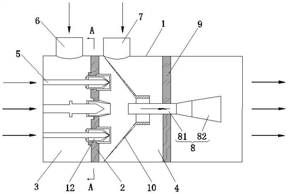 本发明公开了一种多通道组合射流泵,涉及射流泵技术领域,包括:壳体;第一隔板,第一隔板与壳体的内壁固定连接,第一隔板将壳体分为吸入室和混合室,且第一隔板上具有连通吸入室和混合室的通孔;高压流体入口管,高压流体入口管设有多个,多个高压流体入口管间隔分布在吸入室内,每个高压流体入口管的一端均与壳体的第一端连接,每个高压流体入口管的另一端均贯穿第一隔板并延伸至混合室内;第一低压流体入口管,第一低压流体入口管与吸入室连通;第二低压流体入口管,第二低压流体入口管与混合室连通;中压流体出口管,中压流体出口管设置在壳体的第二端,中压流体出口管与混合室连通。本发明能够实现射流泵的多级加能。