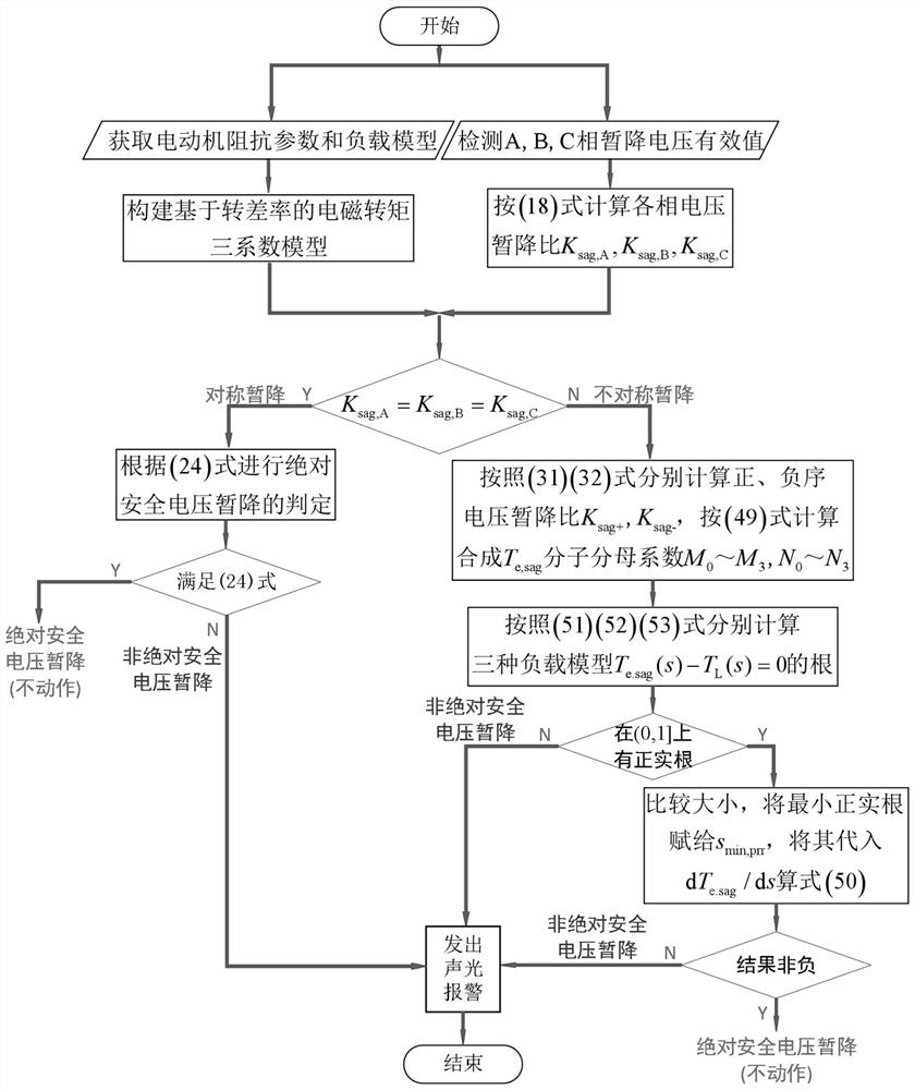 本发明公开了一种电机保护器的绝对安全电压暂降计算方法及系统,方法包括构建基于转差率的电磁转矩三系数模型;计算A相、B相和C相的相电压暂降比;若A相、B相和C相的相电压暂降比均一致,则为对称电压暂降,判断对称电压暂降是否为绝对安全电压暂降;若A相、B相和C相的相电压暂降比不一致,则为不对称电压暂降,进一步基于电动机的合成电磁转矩和负载模型作差结果判断是否存在正实根,若不存在为非绝对安全电压暂降;若存在,判断最小正实根处合成电磁转矩转差率曲线斜率,若结果为非负,则为绝对安全电压暂降,否则为非绝对安全电压暂降。仅依据定子端发生电压暂降时残存电压幅值大小以及负载模型就能准确判断电动机是否绝对安全。