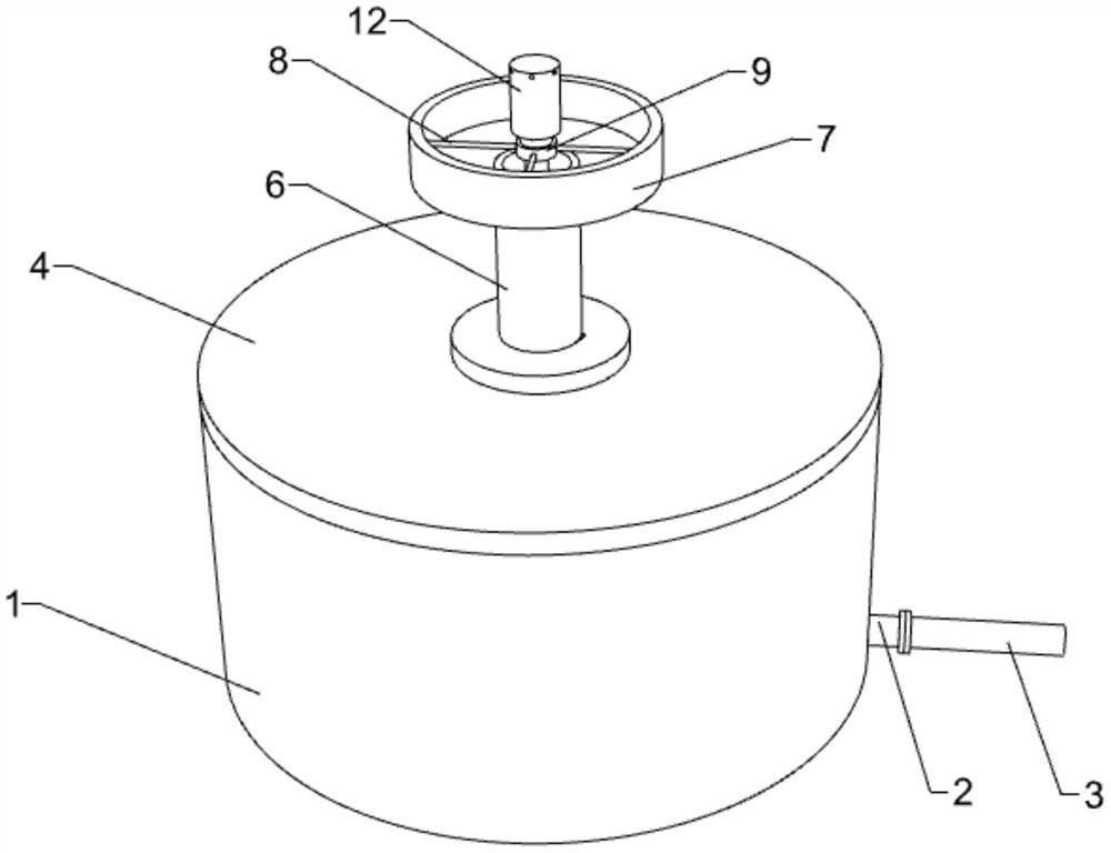 本实用新型公开了一种节能节水绿地浇灌装置,包括有蓄水箱和渗水盖,渗水盖上设置有若干渗水孔;蓄水箱的底部贯穿设置有注水口,注水口连接有注水管;渗水盖上贯穿设置有抽水管,蓄水箱内设置有潜水泵,抽水管的下侧与潜水泵的输出端连接,抽水管的输出端设置有灌溉喷头;抽水管与渗水盖之间还设置有回流部件,回流部件与抽水管设置有回流间隙。本实用新型中通过回流部件,潜水泵将水从抽水管抽到灌溉喷头喷出,灌溉喷头滴漏的水经回流部件回流到蓄水箱内,继续作为灌溉水源,具有了水流回收利用功能。本实用新型不仅具有正常的水流回收利用功能,而且还具有雨水回收功能,雨水可以从渗水盖伸入蓄水箱内从而实现雨水的回收利用。