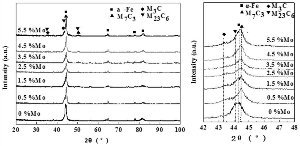 本发明公开了一种制备不锈钢基高硬度耐磨耐蚀合金的方法,涉及不锈钢基高硬度耐磨耐蚀合金制备技术领域,包括以下步骤:对3Cr13不锈钢基体进行预处理,激光熔覆粉末,所述粉末为FeCrC系合金粉和Mo粉的混合粉末;所述Mo粉为基体名义质量分数的0.5%~5.5%。在3Cr13不锈钢基体表面制备含有不同Mo含量的马氏体不锈钢基高硬度耐磨耐蚀熔覆层,随着Mo含量的增加,熔覆层一次枝晶与二次枝晶数量减少,长度明显变短,熔覆层晶粒细化,碳化物数量增多同时Mo部分置换了碳化物中的铬,使晶内基体Cr含量提高;提高了熔覆层的硬度,减少了摩擦磨损过程中磨损深度及剥落量,较大程度地改善了熔覆层的耐蚀性能。