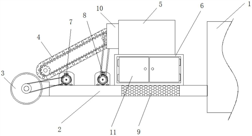 本实用新型涉及河面漂浮物清理技术领域,具体为一种便于清理的河面漂浮物打捞装置,本实用新型通过在粉碎箱内设置粉碎辊,从而便于将收集辊和传送带输送来的漂浮物进行有效粉碎,从而便于后续的收集清理;通过在收集箱内腔顶部设置有收集管,收集管顶部与粉碎箱底部相连通,且收集管为漏斗形,收集袋通过锁紧带与收集管底部相连接,便于将粉碎好的漂浮物收集进收集袋内,又收集箱内部四周侧壁安装有液压缸,液压缸输出端安装有压紧板,且压紧板位置与收集袋位置相对应,从而便于对收集袋内的漂浮物进行压紧,从而减小体积,方便后续的清理,增加空间利用率。