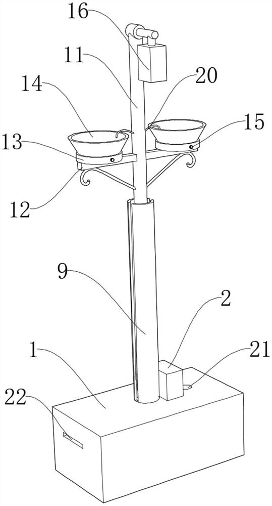 本实用新型公开了一种立体绿化景观设计装置,包括水池,所述水池的顶部固定连接有固定箱,所述固定箱的内壁固定连接有电机,所述电机的输出轴贯穿至电机的一侧并固定连接有第一伞齿轮,有益效果本实用新型中,通过水池和水泵以及主软管和两个次软管的设置,可以给花盆里的植物进行适当浇灌,不容易造成水资源的浪费,并且浇灌的水量较小,不会将花盆里的泥土冲击而造成泥土流失的情况,延长了植物的寿命,且操作简单不费事,通过升降组件的设置,方便了绿植养护人员对植物进行养护和更换,操作简单,省时省力,且方便对灯具进行清洁和维修。