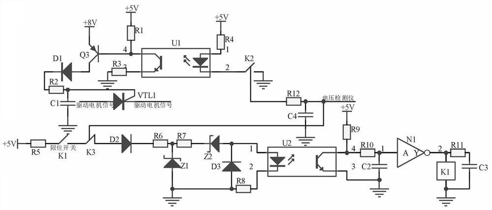 本实用新型模拟电路故障诊断用电压测量装置,设置夹紧通电电路,采用限位开关检测接触夹与导线的夹紧、分离,夹紧时,限位开关闭合,+5V触发光电耦合器U1导通,输出低电平,经延时、非门输出高电平,触发继电器K1延时得电,使得串接在导线中的常开触点闭合,允许导线通电、电压检测仪检测在;设置断电分离电路,在电压检测仪检测完毕,常闭触点K3动作,光电耦合器U2截止、继电器K1失电,导线断电,并经延时触发常开触点K2闭合,光电耦合器U1导通,+8V延时触发晶闸管VTL1导通,允许驱动电机信号驱动电机,允许接触夹对导线进行分离,以此避免夹紧、分离时产生电弧,以及没有泄电,人手接触、电压测量仪检测时,存在伤害人体、仪器的安全隐患问题。