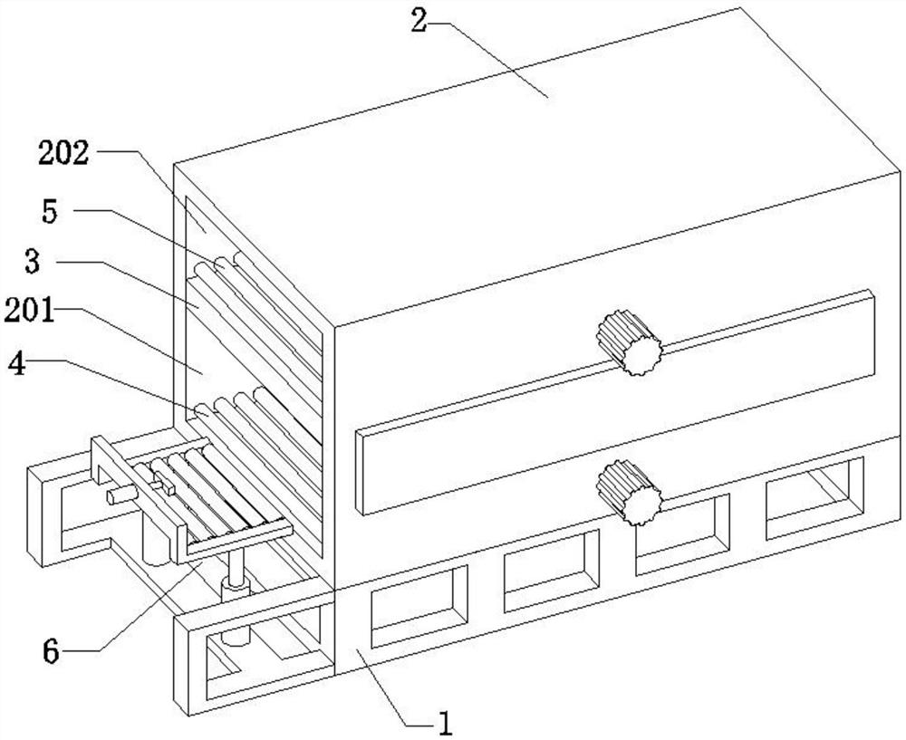 本实用新型公开了一种铸件加工用回火冷却自动化一体机,涉及铸造技术领域,包括:底座、机壳以及转运组件,机壳与转运组件均安装在底座上,机壳内具有上下位布置的冷却舱和回火舱,回火舱与冷却舱内分别布置有第一输送机构、第二输送机构,转运组件包括转运工位以及可驱使转运工位上下往复运动以使转运工位在传输对接第一输送机构与水平对接第二输送机构之间来回切换的第一动力机构、以及当转运工位与第二输送机构水平对接时将转运工位上的铸件推送给第二输送机构的第二动力机构,本实用新型将回火设备与冷却设备上下布置,不仅节约了空间,并且缩短了设备间的距离,使得铸件转运更为方便,继而提升铸造效率。