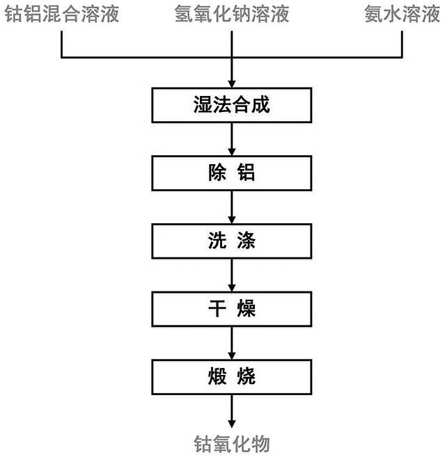 一种高振实密度钴氧化物的制备方法,涉及还原钴粉用高振实密度钴氧化物的制备技术。该方法的具体步骤是:配置钴铝混合溶液,氢氧化钠溶液,氨水溶液;将钴铝混合溶液,氢氧化钠溶液,氨水溶液按照预设的工艺条件并流加入反应釜中进行湿法合成,制备得到大小颗粒均匀分布的高振实密度掺铝氢氧化钴浆料;将合成出的氢氧化钴浆料固液分离,将滤渣加入氢氧化钠溶液中除铝;将除铝后的氢氧化钴洗涤、干燥、煅烧,得到高振实密度钴氧化物产品。利用此工艺,能够制备出振实密度≥2.8g/cm3,微观形貌为球形的大小颗粒均匀分布的钴氧化物产品。
