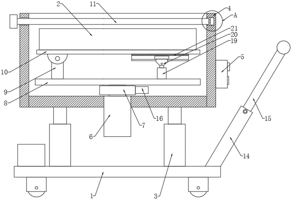 本实用新型公开了一种环境设计用现场测量装置,包括移动底板和激光测距仪,所述移动底板的上表面分别固定安装有第一电动推杆和移动电源,第一电动推杆的伸缩端固定连接有收纳盒,收纳盒的右侧壁设置有控制器,收纳盒的内底壁固定连接有第二电动推杆,第二电动推杆的伸缩端固定连接有旋转盒,旋转盒的顶端转动连接有旋转柱。该环境设计用现场测量装置,通过设置移动底,能够快速将激光测距仪移动至测量位置,在移动时,利用收纳盒和挡盖对激光测距仪进行防护,在使用时,抽离挡盖,控制第二电动推杆伸长,带动旋转盒上升,使激光测距仪从收纳盒的顶端露出,利用激光测距仪直接对周围环境进行测量,使用快速。