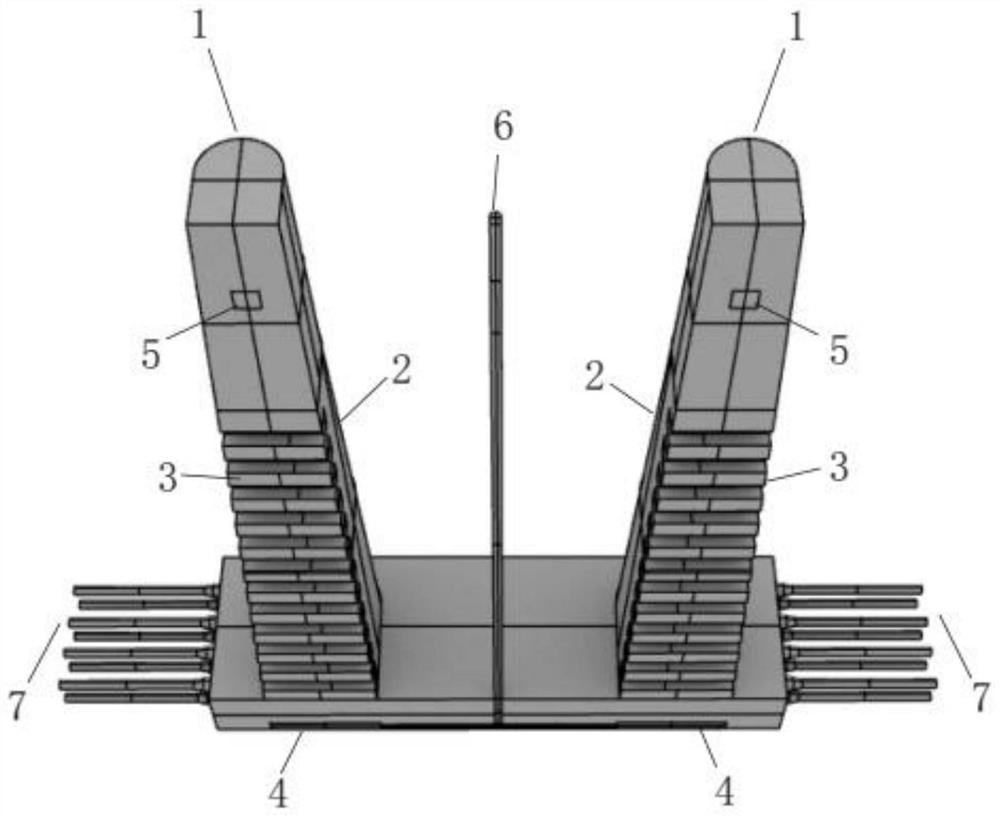 本发明公开了一种悬索桥隧道式锚碇,包括前锚室、锚塞体、后锚室、散索鞍,锚塞体底部采用齿状变截面,后锚室修建于锚碇横梁尾端,锚碇横梁通过两侧根部为圆台形桩身为为圆柱形的预制管桩锚固于岩体之中。本发明通过位于锚塞体底部的齿状变截面,增大了锚碇结构与围岩之间的侧摩阻力,获得更大的承载力;本发明通过锚碇横梁与横向预制管桩,将左右锚塞体连接为一个整体,增大了左右锚碇整体性,左右锚塞体、锚碇横梁、预制管桩和围岩整体受力,预制管桩以抗拉弯能力分担了主缆拉拔荷载,增大了隧道式锚碇的抗拉拔能力。本发明与传统的隧道式锚碇结构相比增大了锚碇结构的承载能力,提高了隧道式锚碇在岩体条件较差围岩中的适用性。