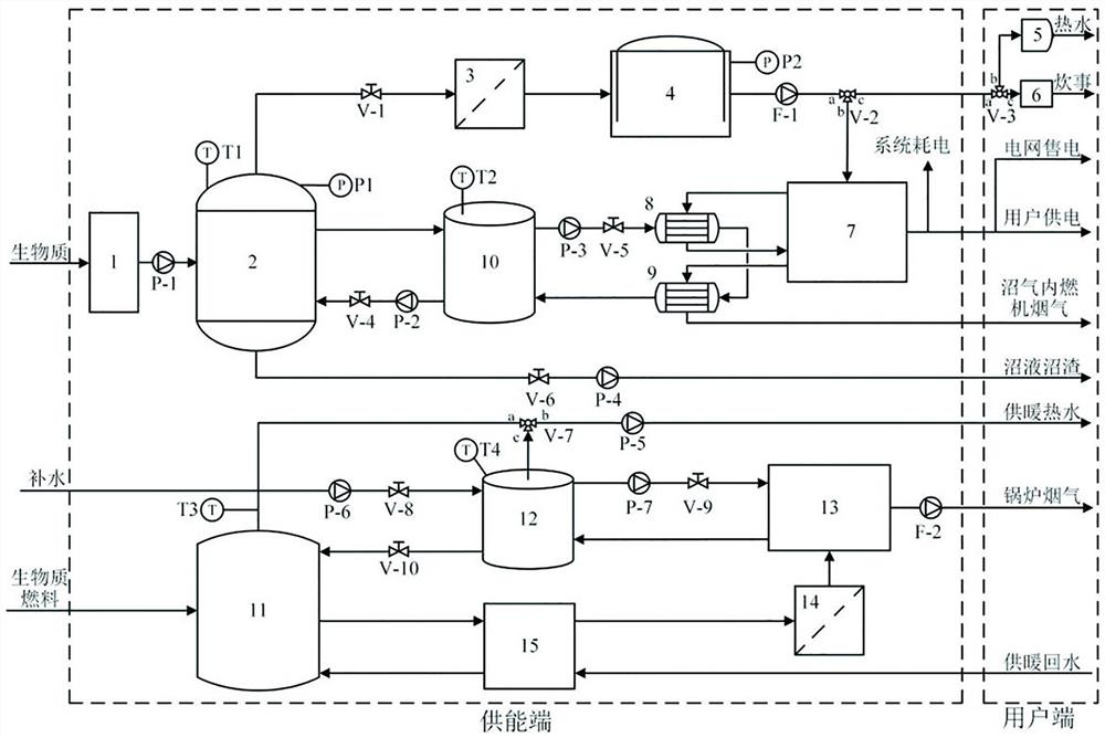 一种以生物质能输入的热电气肥联供系统,属能源利用及转化技术领域。系统以生物质能为输入,热、电、气和沼液沼渣为输出。生物质经过预处理后进行恒温厌氧发酵转化为沼气和沼液沼渣,沼气经过净化装置后进入贮气罐贮存,贮存沼气一部分直供用户端,用于满足炊事和燃气热水器的用气需求,剩余沼气进入沼气发电机进行热电联产,沼液沼渣供用户作有机肥使用;生物质燃料送入生物质直燃锅炉燃烧来生产供暖热水,锅炉烟气首先进入省煤器回收部分烟气余热,接着通过烟气净化装置,最终通过空气源热泵回收生物质锅炉烟气潜热;蓄热系统用于调节能量供需匹配的问题。