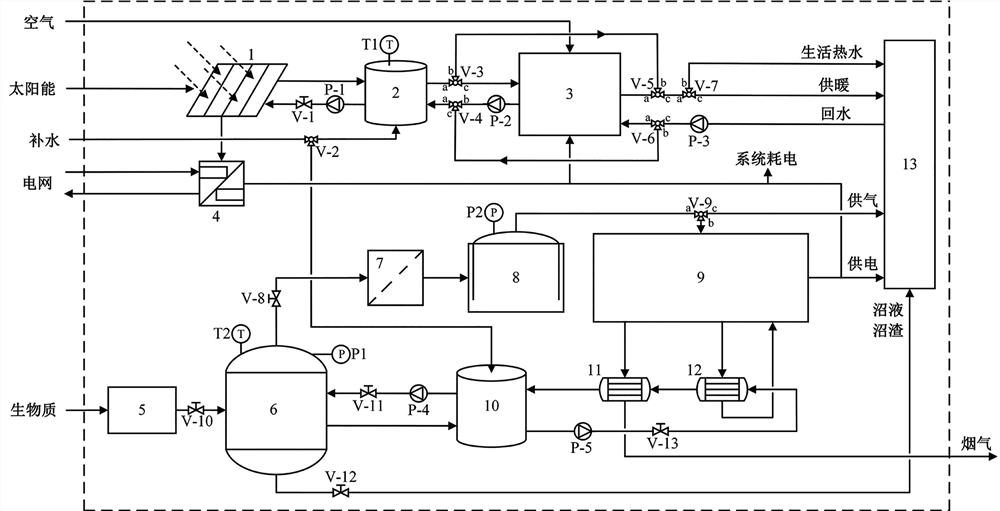 一种多可再生能源互补的热电气肥联供装置,属能源利用及转化技术领域。系统以生物质能、太阳能和空气能为输入,热、电、气和沼液沼渣为输出。生物质经过预处理后进行恒温厌氧发酵转化为沼气和沼液沼渣,沼气经过净化装置后进入贮气罐贮存,贮存沼气一部分直供用户炊事使用,一部分进入沼气发电机进行热电联产,沼液沼渣供用户作有机肥使用;太阳能经光电光热一体化组件转化为电能和热能供用户使用;空气能和太阳能的低位热能经双热源热泵提升品位后供用户使用。蓄热系统调节能量供需匹配的问题,控制器用于控制系统是否外接电网。