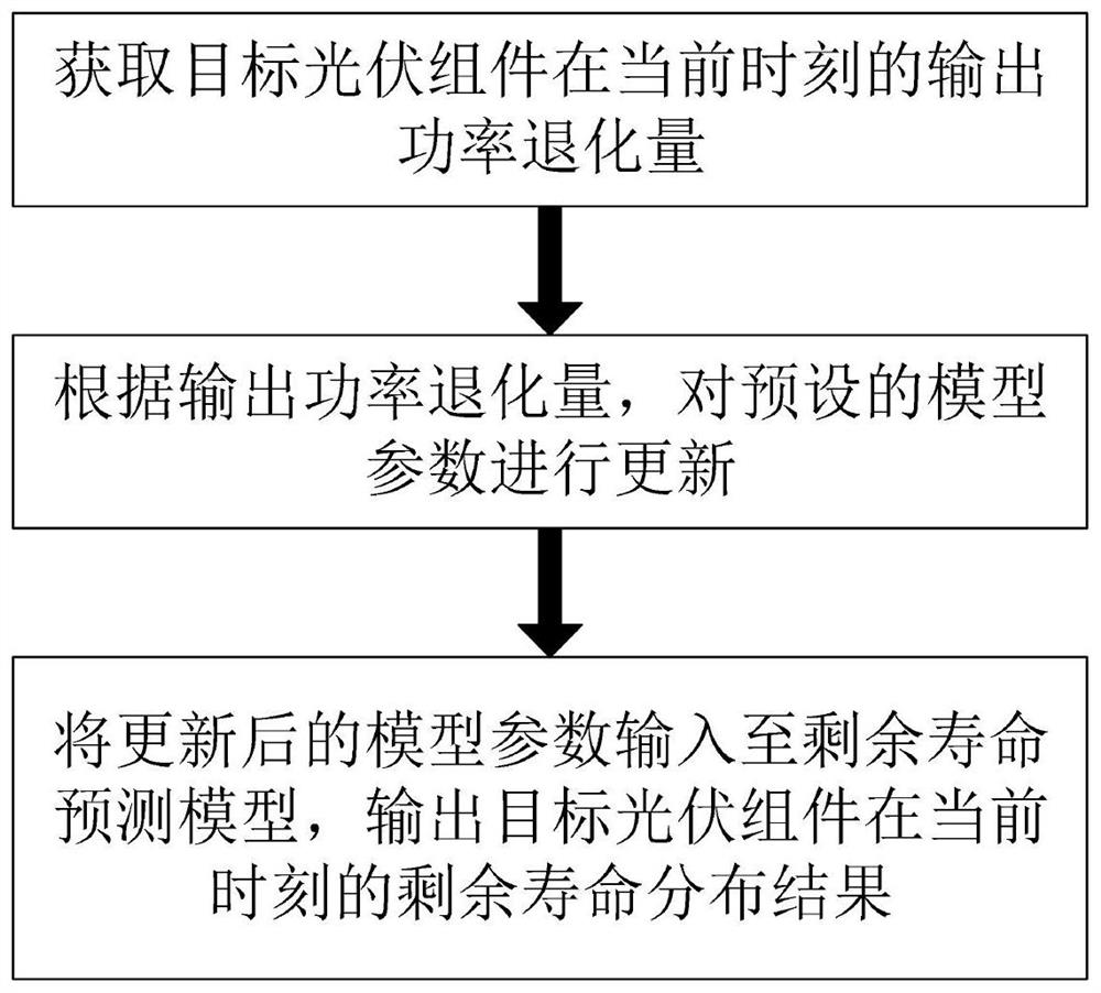 本发明公开了一种光伏组件剩余寿命预测方法及预测系统,包括:获取目标光伏组件在当前时刻的输出功率退化量;根据输出功率退化量,对预设的模型参数进行更新;将更新后的模型参数输入至剩余寿命预测模型,输出目标光伏组件在当前时刻的剩余寿命分布结果;通过该方法可以在刻画目标光伏组件的退化特性时,考虑到光伏组件退化所呈现出来的非单调性、随机性以及个体差异性,并可以利用实时输出功率退化量数据进行结果的更新,从而提高对光伏组件剩余寿命预测的准确性。