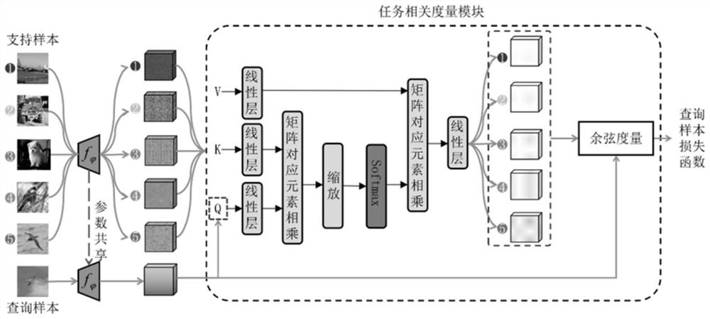 本发明公开了一种面向小样本图像分类的任务相关度量学习方法及装置,方法主要由数据预处理阶段、构建网络模型阶段、训练模型参数阶段和测试模型性能阶段组成,本发明通过考虑不同任务之间的差异性,引入注意力机制的思想,并学习任务相关的空间映射,利用任务自适应度量学习的方式,解决了小样本图像分类中存在的自适应度量学习问题,从而提高在小样本条件下目标任务分类的准确性,改善了图像的分类效果,具有很高的实用价值。