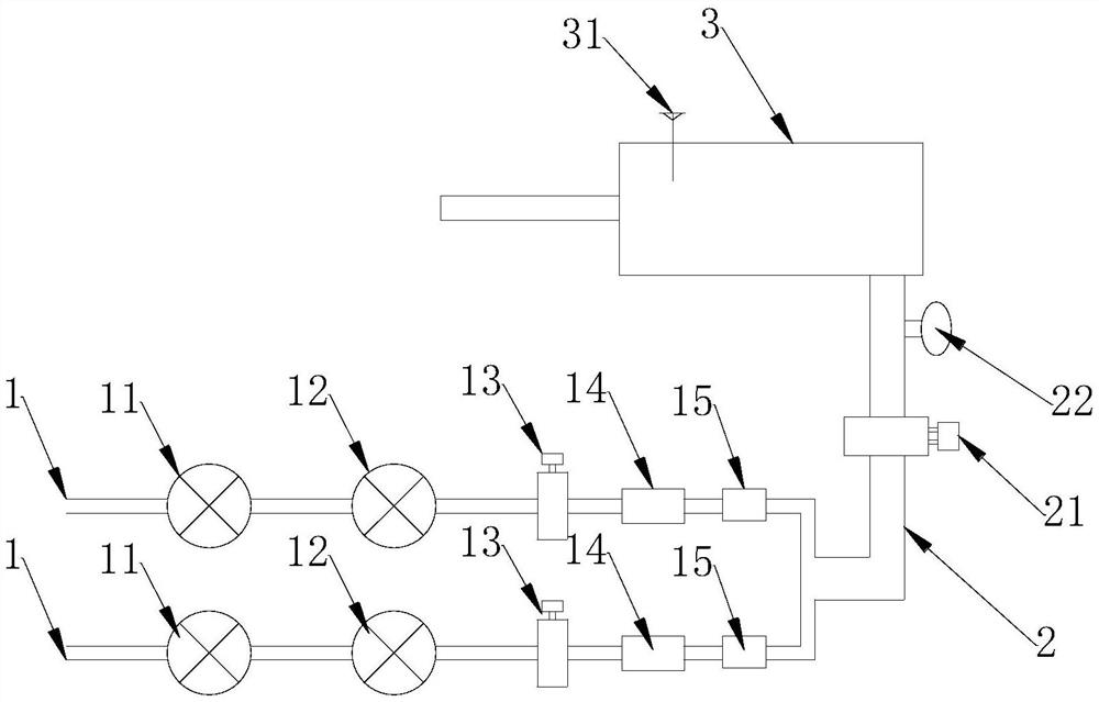 混合气自动配比柜,包括多个待混气通道以及混合气机构,所述待混气通道的出口连接至混合气机构的进口;所述待混气通道上设有减压装置以及流量检测及控制装置,所述流量检测及控制装置对待混气通道内的流量进行检测并控制待混气通道内的流量。通过流量检测及控制装置能够更直观、更快速和更准确地调整待混气的混合比例;并且当故障或变化发生后,使用者可以自行快速发现并自行解决,防止等待维护过程出现停机停产损失。