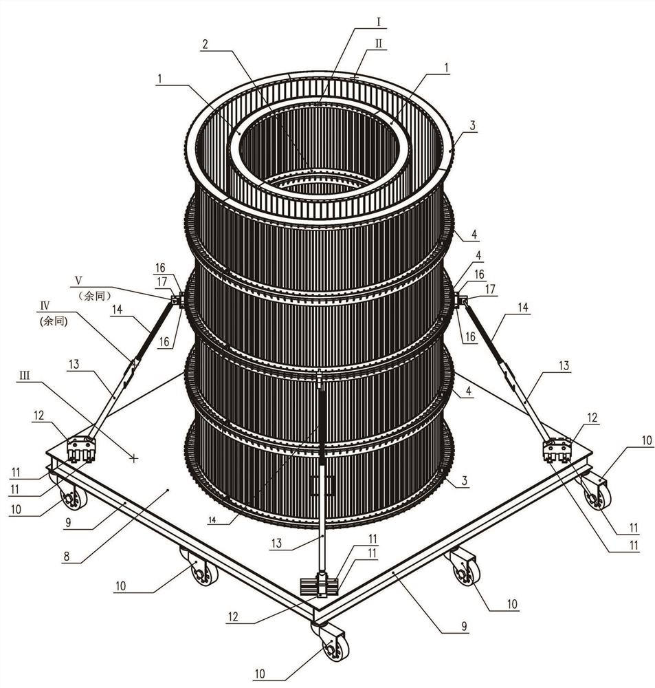 一种模块化圆形PC井室预制模板与施工组装及拆除方法,模板包括内模、外模、底板、斜撑、扣件,内模、外模均由龙骨、条板、卡条、面层组合而成,其中龙骨上设有限位孔,众多条板通过构造固定于龙骨限位孔上且用卡条固定,面层紧贴于条板面板上,组成内模与外模;龙骨有两种截面类型,可分段拼装,不同直径的模板需使用相应直径的龙骨;条板、卡条、面层以及底板、斜撑、扣件均可在不同直径的模板间重复使用;斜撑用于固定模板在底板上的位置,且加强模板的强度;底板设有万向滑轮,方便产品的转场。本发明构造合理、装便捷、灵活多变,能够实现不同直径、高度PC井模板间的变形,兼具钢模具的高强度与较好的产品表面光洁度。
