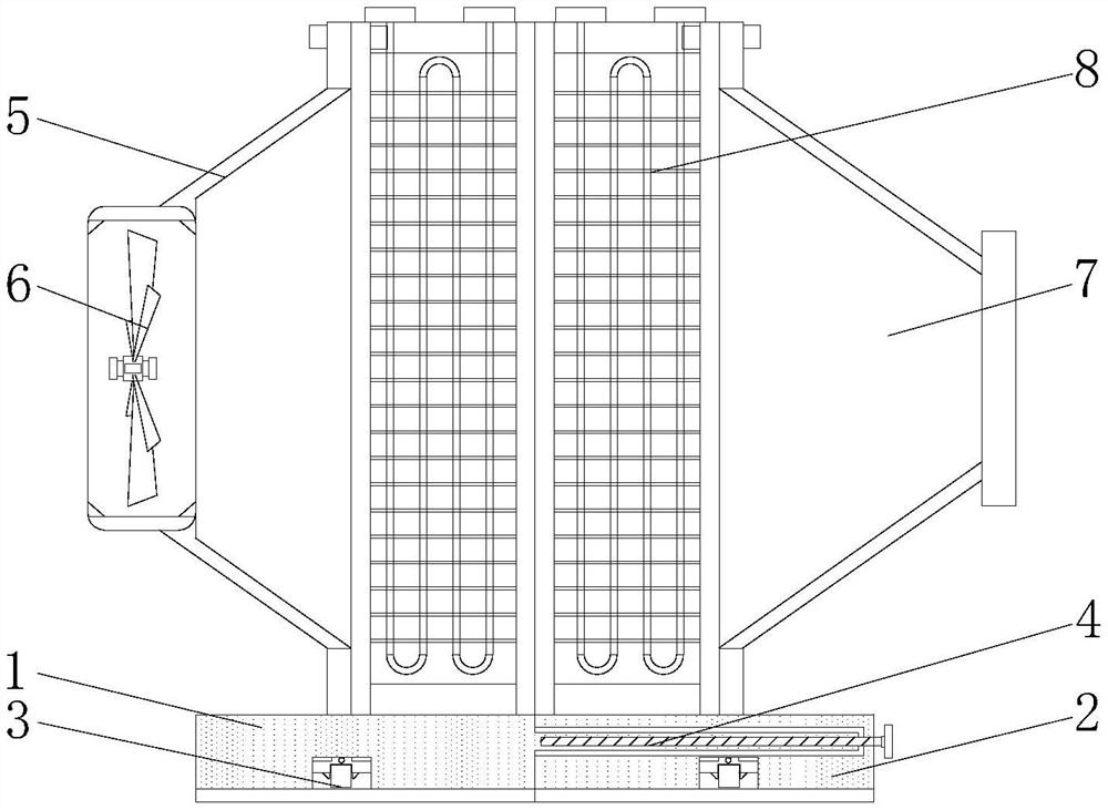 本实用新型公开一种可调节的可再生能源系统换热器,属于再生能源利用技术领域,包括第一底板,所述第一底板的一侧设置有第二底板,所述第一底板与第二底板的底部皆设置有移动机构,所述第一底板与第二底板之间设置有伸缩机构,所述第一底板的顶部设置有进气罩,所述进气罩的一端安装有风机。本实用新型第一底板顶部进气罩的设置,以及第二底板顶部排气罩的设置,配合第一底板、第二底板之间滑板、单向螺杆、调节块组成的伸缩机构进行使用,能够在使用的过程中,调节进气罩与排气罩之间的间距,将多组换热器安装到其内部之间,对装置的长度进行调节,继而控制装置使用过程中的换热速率,实用性更高。