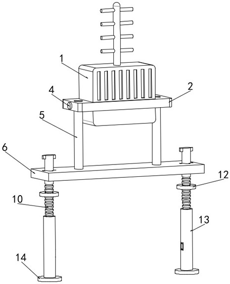 本实用新型公开了一种用于目标跟踪的雷达装置,包括雷达本体,所述雷达本体的外壁连接有固定环,所述固定环的外壁开设有两个对称分布的第一螺纹孔,所述第一螺纹孔的内壁螺纹连接有螺钉,所述固定环的上端开设有两个对称分布的圆孔,所述第一螺纹孔与圆孔相连通,所述圆孔内插设有导杆,所述导杆与螺钉螺纹连接,所述导杆的下端连接有连板;转动螺纹管,使螺纹管与螺纹杆的总长度增大,从而使连板的高度增大,连板也就撑起了导杆的高度,进而使雷达本体的高度增大,从而实现了雷达本体的高度增大,如需要拆下,逆向上述操作,然后,拧开螺钉,将导杆与固定环分开,可以降低各个零件的空间占用。