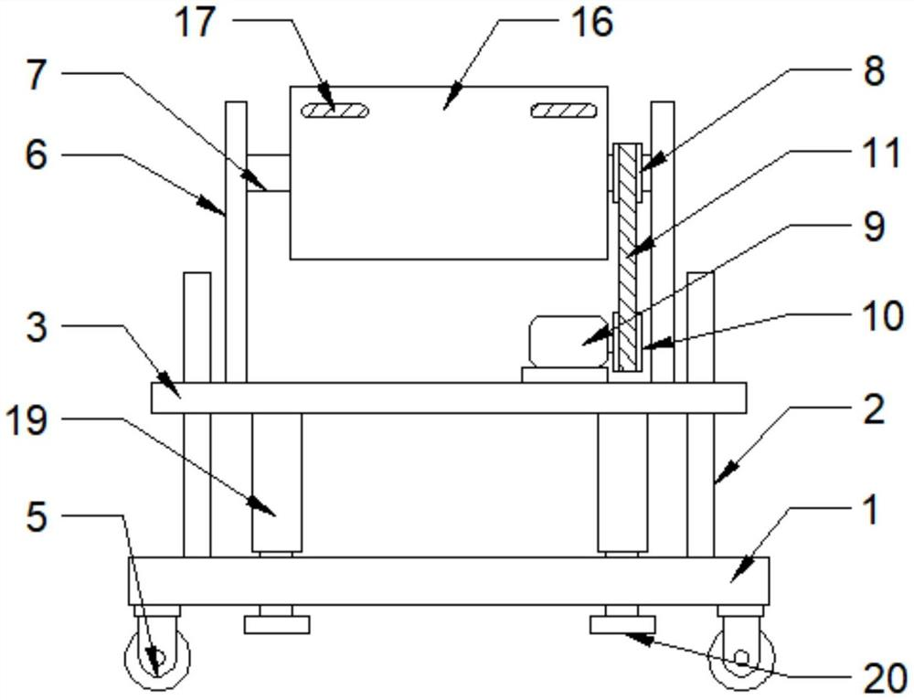 本实用新型公开了一种平面设计用辅助工具,包括移动底座、导向滑杆、升降基座和固定通槽,所述移动底座上安装有导向滑杆,所述导向滑杆上设有升降基座,所述移动底座上设有固定通槽,所述移动底座底部安装有万向轮,且万向轮位于移动底座底部四角处。本实用新型的有益效果是,通过万向轮方便对装置进行移动,通过驱动电机驱动转动杆进行转动,转动杆通过固定套筒带动设计板转动,方便调节设计板的角度,方便进行使用,连接滑杆可以固定套筒内滑动,方便调节设计板的前后位置,便于进行使用,通过电动液压推杆伸缩带动防滑底板移动,防滑底板与地面接触将装置支撑起来,方便调节装置的高度,适用于不同身高的人使用。