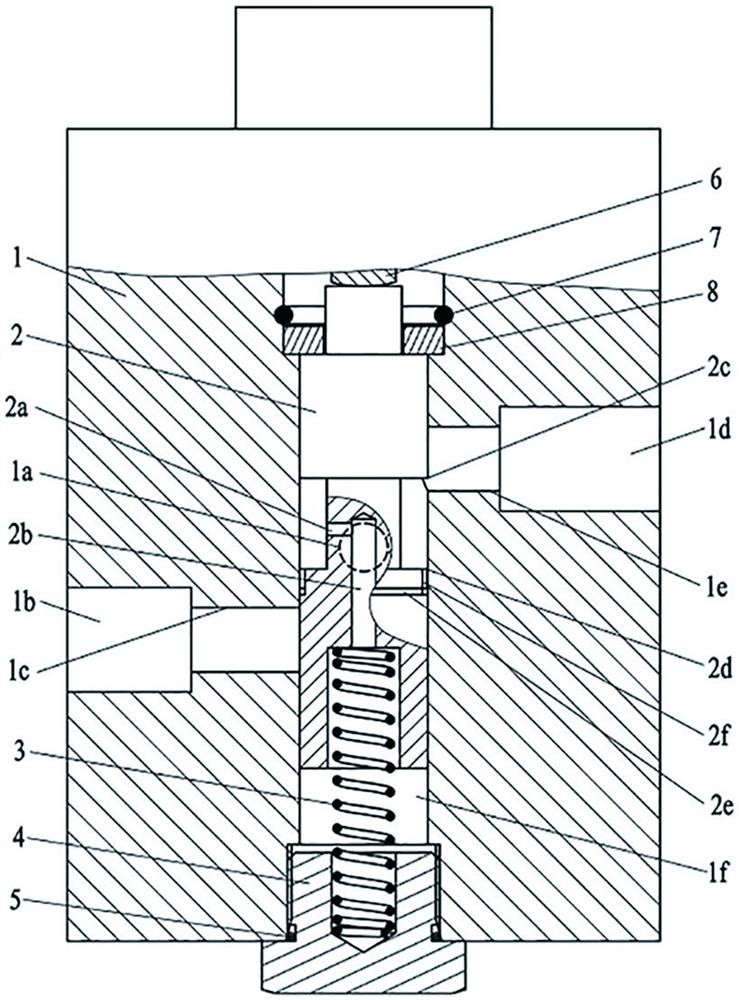 一种阀芯带有预升压槽的三通压力控制阀,阀芯(2)装在阀体(1)的阀孔(1f)中,阀芯(2)的一端与驱动杆(6)接触,并由挡圈(8)与孔用开口挡圈(7)限位,阀芯(2)的另一端通过弹簧(3)与螺堵(4)限位,阀孔(1f)的一端由驱动杆(6)的驱动装置封闭,阀孔(1f)的另一端由螺堵(4)和O形密封圈(5)进行封闭和密封;阀体(1)设有负载油口(1a)、压力油口(1b)和回油口(1d),阀芯(1)在阀孔(1f)中的初始安装位置形成负载油口(1a)与回油口(1d)连通、压力油口(1b)封闭的状态。