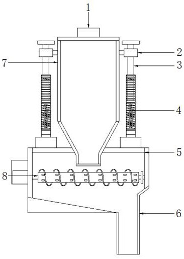 本实用新型公开了一种ABS合成树脂送料振动装置,包括进料壳体和排料箱,所述进料壳体的顶部中间设置有振动电机,所述排料箱的内部中间且是位于进料壳体的底部位置设置有排料装置,所述排料装置包括两个转动杆和驱动电机,所述转动杆的两端均设置有连接杆,所述连接杆的上均设置有齿轮且之间相齿合连接,所述转动杆上设置有螺旋叶片,所述转动杆上设置有若干槽体。本实用新型通过排料装置,可以便捷的对树脂的送料速度进行调节,提高了使用的便捷性,避免了卡料的现象。