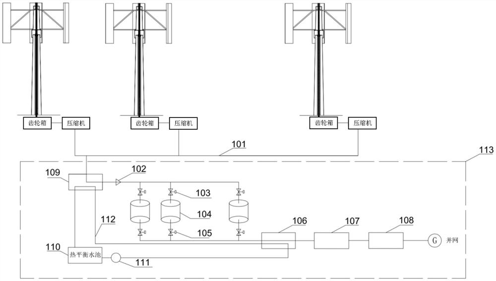 本实用新型属于风力发电技术领域,公开了一种分布式风力机群直接压缩空气连续发电装置,分布式风力机群通过绝热压缩空气,压缩后的高温高压空气通过保温管道汇集到空气站,并在进入空气站时通过第一换热器将高温高压的空气降温后进入多个高压气罐存储。在每个气罐处设置单向阀固化空气流动方向。储气罐另一端的单向阀通过第二换热器后与透平机发电机连接,发电机通过连接线路与外部电网连通。本实用新型利用风力机群直接压缩空气,采用绝热压缩,利用两个热交换器在压缩和膨胀时达到热平衡,提高能量转化效率;配合高压电磁阀、储气罐及电动压力调节阀实现压缩空气压力可控输出,实现透平发电机稳定输出电能,并且输出功率可调。