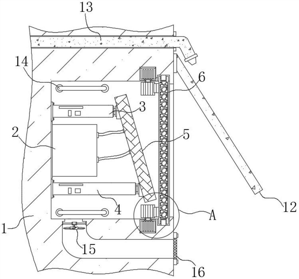 本实用新型公开了一种太阳能与建筑一体化的建筑结构,包括建筑墙体,建筑墙体的内腔中设有锂电池,建筑墙体的内腔中设有第一电推杆和第二电推杆,第一电推杆和第二电推杆的侧端连接有太阳能电板,建筑墙体的内部设有滑门,滑门的上下端设有一排滚轮,滑门的侧面设有齿条道,齿条道对接有电机齿轮,电机齿轮连接在伺服电机顶端,滑门上设有防撞软垫,建筑墙体的侧端设有挡护玻璃板,建筑墙体的内部设有喷水管。本实用新型通过设置第一电推杆和第二电推杆,这样在进行工作时,可以将滑门打开,再同时启动第一电推杆和第二电推杆,使得太阳能电板移动到建筑墙体的外部进行太阳能吸收即可,在不工作时可以进行收纳,十分好用。