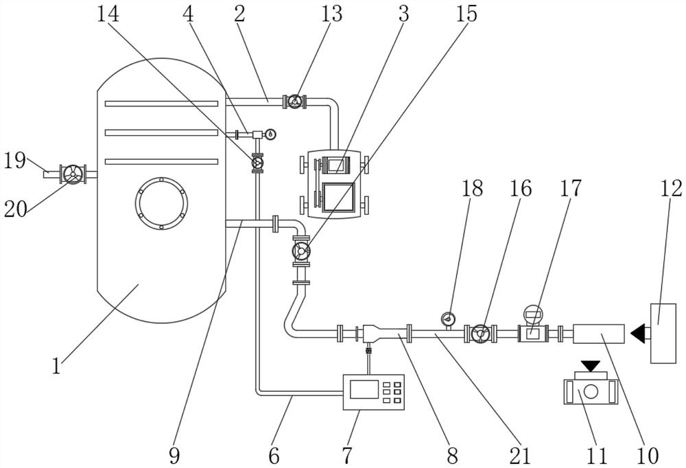 本实用新型提供了一种气流场PIV测试系统及示踪粒子的高速投放装置,属于气流场测量仪器技术领域,它解决了目前在高速、管道内气流场环境投放示踪粒子时测量精度降低,达不到PIV成像测试要求的问题。本实用新型包括储气罐、CCD相机和激光片光源,储气罐的一侧设置有气体压缩机,气体压缩机的一端连通设置有输气管,输气管的另一端贯穿至储气罐的内部,储气罐的一侧分别连通设置有连通管和输送管。本实用新型不仅能够使被测气体与示踪粒子均匀混合,还可以使速度较小的示踪粒子加速通过投放装置,以达到被测管道内气体的速度要求,避免示踪粒子的速度过慢,本实用新型的所提供的方案不仅操作便捷,同时还可以有效提升测试结果的准确性。