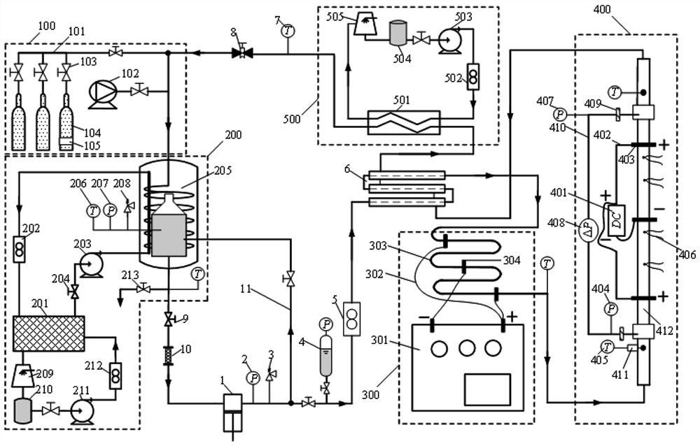 本实用新型提供了一种高温高压二氧化碳管内流动传热测试实验装置,属于二氧化碳热工水力测试领域,用于解决现有超临界二氧化碳发电系统的气冷壁和换热器难以有效测量问题。包括依次连接的高压二氧化碳泵、压力传感器、主管安全阀、气囊式稳压器、系统流量计、回热器、主管铠装热电偶、压力调节阀、系统截止阀和过滤器,回热器分别连接有预热系统、实验段测量系统和冷却系统,冷却系统连接在回热器和主管铠装热电偶之间,压力调节阀和系统截止阀之间连接有相互连通的抽真空注液系统和冷凝储液系统,冷凝储液系统连接有支路;本实用新型可进行不同压力、温度、管径、加热功率的超临界二氧化碳流动传热及不稳定性测试。