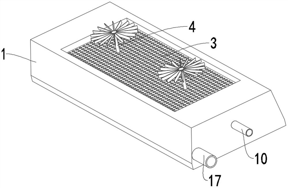 本实用新型公开了一种基于超疏水膜的曝气板,包括板体,所述板体的内侧壁上开设有空槽,所述板体的顶部固定设置有曝气孔,所述板体的顶部活动设置有转动叶片,所述空槽的内侧壁上设置有升降机构,所述板体的侧壁上固定设置有进气管,所述板体的侧壁上固定设置有出水管,所述进气管的内侧壁上设置有拉动组件,所述升降机构包括固定设置在所述空槽内底部的升降管,本实用新型中,通过升降机构与拉动组件之间的配合使用,实现在气体冲出升降板下降,结束通气时,升降板回复上升,有效的阻挡了池内液体进入空槽内的现象,对曝气板内部起到了一定的保护作用,避免液体进入产生不良影响,提高装置的使用寿命。