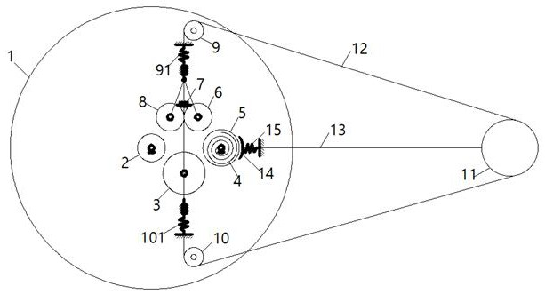 本发明公开了一种基于形变能的自行车动能回收装置,具体涉及自行车部件技术领域,所述动能回收装置包括第一摩擦轮、第二摩擦轮、第三摩擦轮、摩擦轮组、手轮和抱死机构;所述第三摩擦轮上设置有旋转弹簧,所述第二摩擦轮的下方设置有第一导线滑轮,所述摩擦轮组上方设置有第二导线滑轮,所述手轮、第一导线滑轮、第二导线滑轮摩擦轮组和第二摩擦轮通过刹车线连接;所述抱死机构通过报闸线与手轮连接。本装置采用纯机械结构实现刹车与储能的双重功能,而且能量利用率高,反应较为迅速,与传统的刹车片相比对环境无污染,不易损坏,可靠性高,适用于市面上大部分型号的自行车使用。