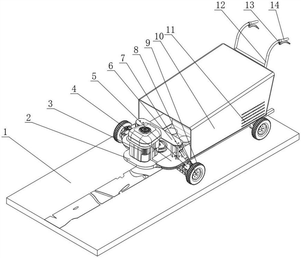 本实用新型公开一种带清除结构的划线设备,包括轮毂和轮胎,所述轮胎的内部设置有轮毂,且轮胎的下方设置有地面,所述轮胎的内部设置有轮毂,所述轮毂的前端设置有底杠,所述底杠的顶端中部设置有底板,本实用新型的带清除结构的划线设备在使用的时候实现划线机的除线、划线一体化,大大降低成本,其次配备自动清扫装置,可将路面不利于划线的碎屑和已损坏的道路标志线直接通过清扫装置的毛刷刷出工作区域,喷涂更加均匀稳定,还有喷枪支架可根据喷涂需求自由灵活地进行调节,还能够缓冲装置可以减轻工作中机器的震动,工作状态稳定,最重要的是智能驾驶模式,大大降低人工劳动强度,划线效率更高,质量更优。