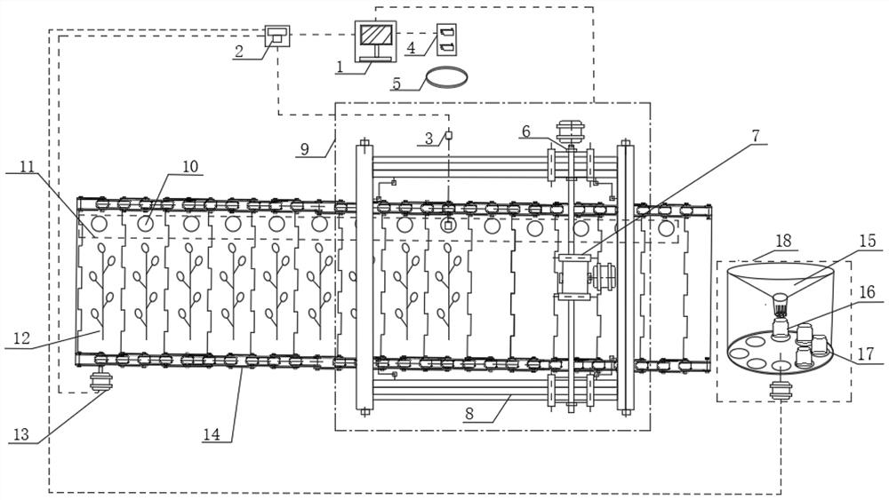 本发明提供了一种基于机器视觉的激光切割脱毒苗茎的方法及其装置,属于脱毒苗扩繁技术领域,用于解决现有脱毒苗人工扩繁操作复杂、污染率高、自动化程度低等问题。包括工控机、对射型光电开关、激光切割机构、图像采集模块、输送机和芽苗收集机构,工控机上设有数据采集卡,输送机上的链板式传送带的内侧设有缝隙遮挡带,本发明由工控机控制整套装置完成作业,控制传送电机带动链板式传送带做间歇输送工作,传输定位模块与图像采集模块配合,快速锁定脱毒苗位置,精准识别并分析,获取脱毒苗每一个芽眼的位置,得到相邻两个芽眼的中点,得出切割路径,激光切割机构进行有效稳定的切割,芽苗收集机构进行有效收集扩繁。