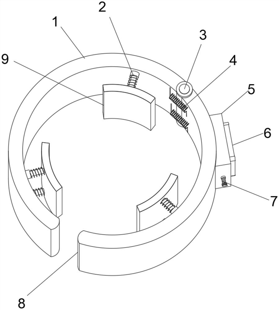 本实用新型公开一种用于管道水流数据的低功耗数据采集器,其包括:安装套环和均匀分布于安装套环内侧的三个挤压板,所述挤压板和安装套环之间连接有限位夹紧机构,在工作时,通过转轴对安装套环进行翻转,使得安装套环上的开口扩大,将安装套环套设于管道外壁,此时,管道外壁会对三个挤压板进行挤压,使得挤压板带动导向杆向着固定套筒内部进行移动,对第一复位弹簧和第二复位弹簧进行压缩,而压缩后的第一复位弹簧和第二复位弹簧会对导向杆施加一个向外顶出的力,从而使得三个挤压板能够向安装套环中心处靠近,从而对管道进行夹紧,操作简单,使用方便,能够适应不同管径的管道,大大提高安装效率,可多次重复利用。