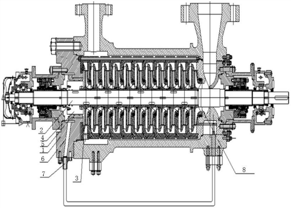 本实用新型提供提高多级泵的抗汽蚀和轴向力平衡能力的平衡管系统,包括泵体、泵轴、首级叶轮、次级叶轮、末级叶轮,所述泵轴安装在泵体内,首级叶轮、次级叶轮、末级叶轮均安装在泵轴上,泵轴上固定设置有一个平衡鼓,平衡鼓位于末级叶轮和泵体之间,所述平衡鼓呈圆柱体,平衡鼓与泵体之间留有间隙,平衡鼓后侧的泵体内设置有空腔,所述的空腔连接有一个连通管,所述连通管穿过泵体与首级叶轮进口处相连通。本实用新型中连通管穿过泵体与首级叶轮进口处连通,不仅可以平衡多级泵的轴向力,还可以提高多级泵抗汽蚀性能。