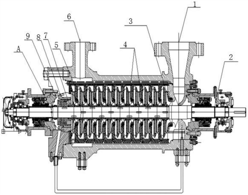 本实用新型提供一种带有双螺旋的新型平衡鼓,包括泵体、泵轴、叶轮、平衡鼓、平衡套、平衡腔,泵体一侧为吸入口,另一侧为出口,泵轴安装在泵体内,首级叶轮、次级叶轮、末级叶轮依次安装在泵轴上,平衡鼓设置于末级叶轮与泵体之间,平衡鼓固定套在泵轴上,所述平衡鼓呈圆柱体,平衡鼓和泵体之间留有间隙,平衡鼓后侧的泵体内设置有平衡腔,平衡鼓外圆侧的泵体内壁上设置有一个平衡套,平衡套与泵体内壁固定连接,平衡套呈圆柱管状,平衡套与平衡鼓之间留有间隙,在平衡鼓与平衡套外圆周表面加工有双头反向螺旋槽,在平衡套与平衡鼓端面加工有消旋槽。本实用新型通过增设消旋槽进一步降低了间隙流体的流速,增高了压降。