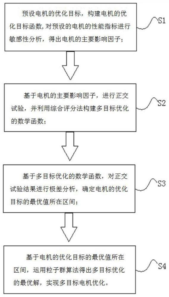 本申请公开了一种基于正交分析的粒子群多目标电机优化方法及系统,本方法包括:预设电机的优化目标,构建所述电机的优化目标函数,对所述预设的电机的性能指标进行敏感性分析,得出电机的主要影响因子;基于所述电机的主要影响因子,进行正交试验,并利用综合评分法构建多目标优化的数学函数;基于所述多目标优化的数学函数,对正交试验结果进行极差分析,确定所述电机的优化目标的最优值所在区间;基于所述电机的优化目标的最优值所在区间,运用粒子群算法得出多目标优化的最优解,实现多目标电机优化。本申请利用正交实验的均衡分散性有效减少试验次数,得到最优组合并利用粒子群算法小范围寻优,得到较好的优化结果,同时提高优化效率。