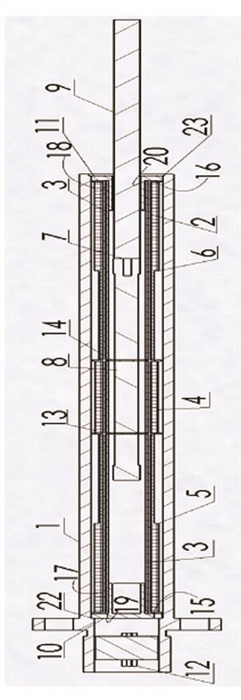 一种高精度长行程阀用LVDT位移传感器,内耐压管(3)同轴安装在绕线架(2)内,绕线架(2)的外壁面中间位置密绕有激磁线圈组(4),激磁线圈组(4)两端对称布置左励磁线圈组(5)和右励磁线圈组(6),激磁线圈组(4)的长度分别为左励磁线圈组(5)和右励磁线圈组(6)的2/5,左绝缘挡板(13)位于激磁线圈组(4)与左励磁线圈组(5)之间,右绝缘挡板(14)位于激磁线圈组(4)与右励磁线圈组(6)之间,内耐压管(3)内为沿轴向可动的测量杆(7),测量杆(7)由铁芯(8)和连杆(9)构成,连杆(9)的一端伸出内耐压管(3)外,左导磁端盖(10)和右导磁端盖(11)分别安装在内耐压管(3)两端。